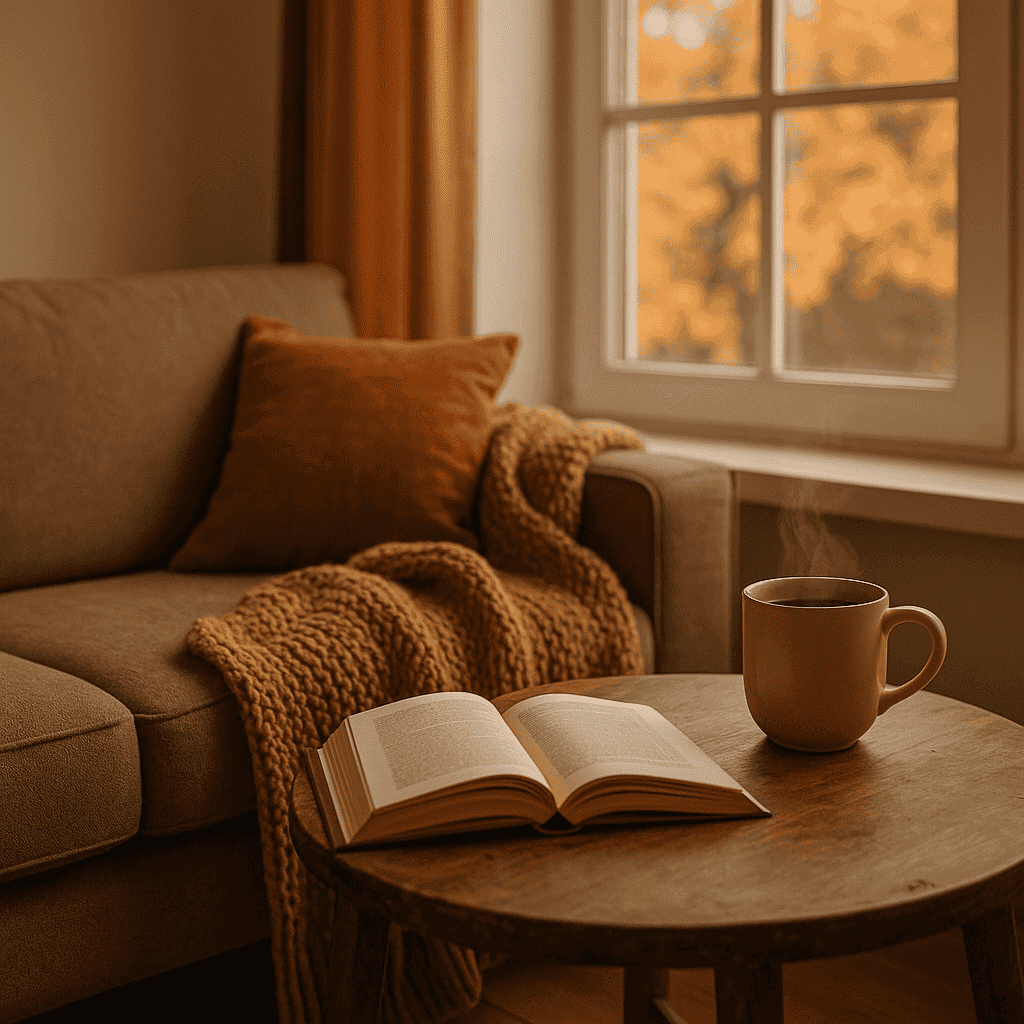 alt="Ein herbstlich eingerichtetes Wohnzimmer mit braunem Sofa, Kuscheldecke und offenem Buch auf einem Holztisch neben einer dampfenden Tasse Tee – perfekte Cozy-Atmosphäre für entspannte Lesestunden im Herbst." class="wp-image-2163"/>1. „The Comfort Book“ von Matt Haig