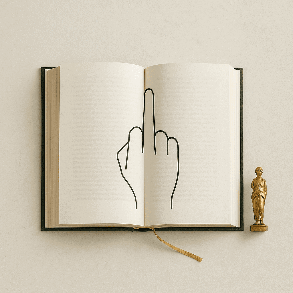 Stilvolles Bild mit aufgeschlagenem Buch, das humorvoll eine stilisierte Mittelfinger-Zeichnung zeigt. Symbolisch für Gelassenheit und Abgrenzung im Sinne des Ratgebers ‚Wo ein Fuck it ist, ist auch ein Weg‘, dekoriert mit goldener Statue. class="wp-image-1275" alt="Stilvolles Bild mit aufgeschlagenem Buch, das humorvoll eine stilisierte Mittelfinger-Zeichnung zeigt. Symbolisch für Gelassenheit und Abgrenzung im Sinne des Ratgebers ‚Wo ein Fuck it ist, ist auch ein Weg‘, dekoriert mit goldener Statue." >